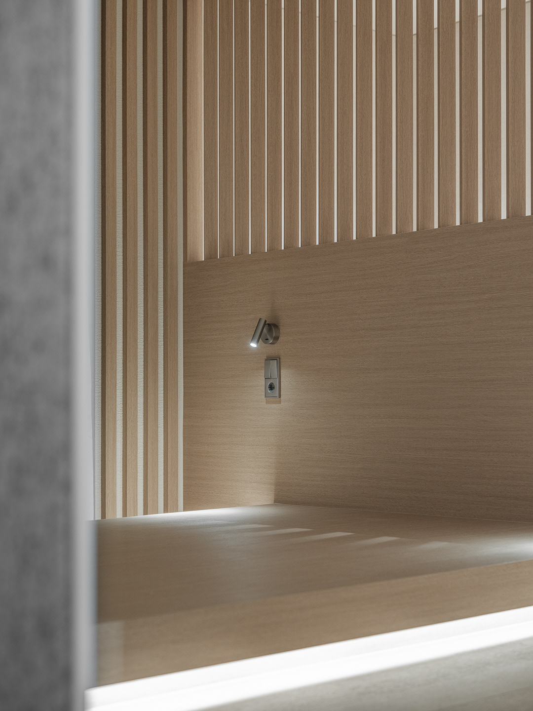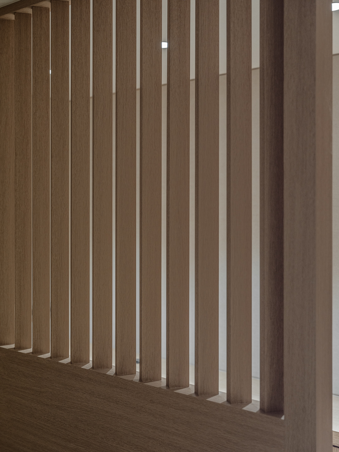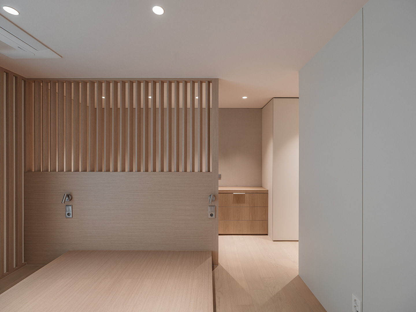 헤드 뒤로 이어지는 간살 파티션은 시각적으로 공간을 부드럽게 분리하면서도, 안정감과 여유로움을 동시에 전달합니다.