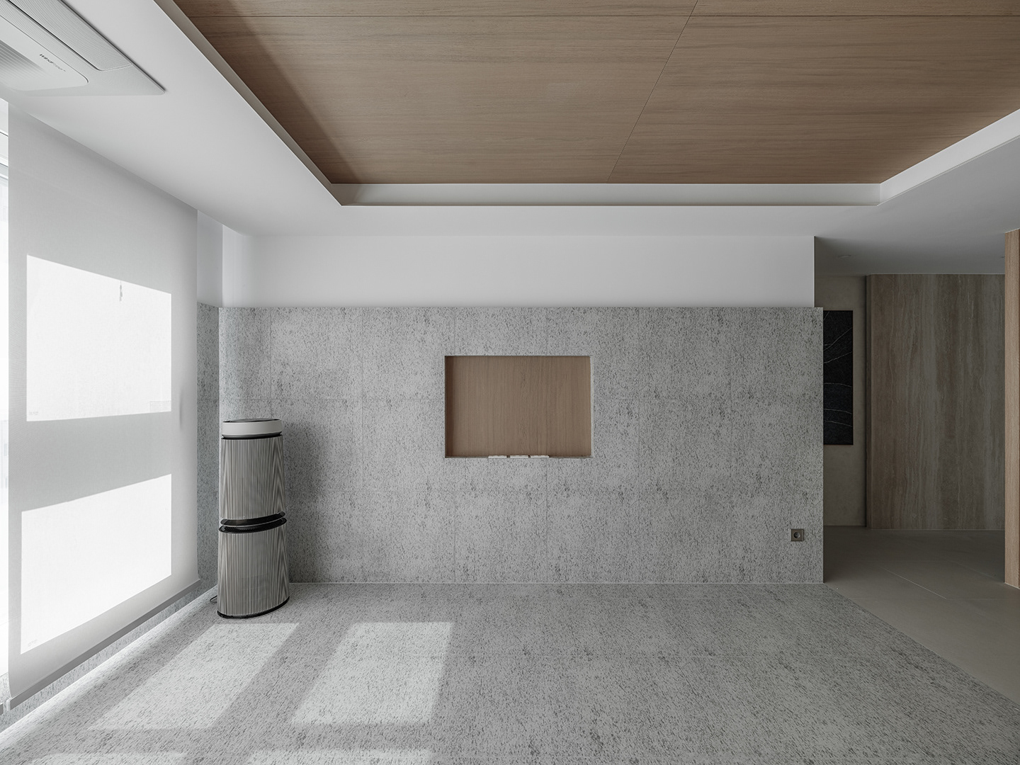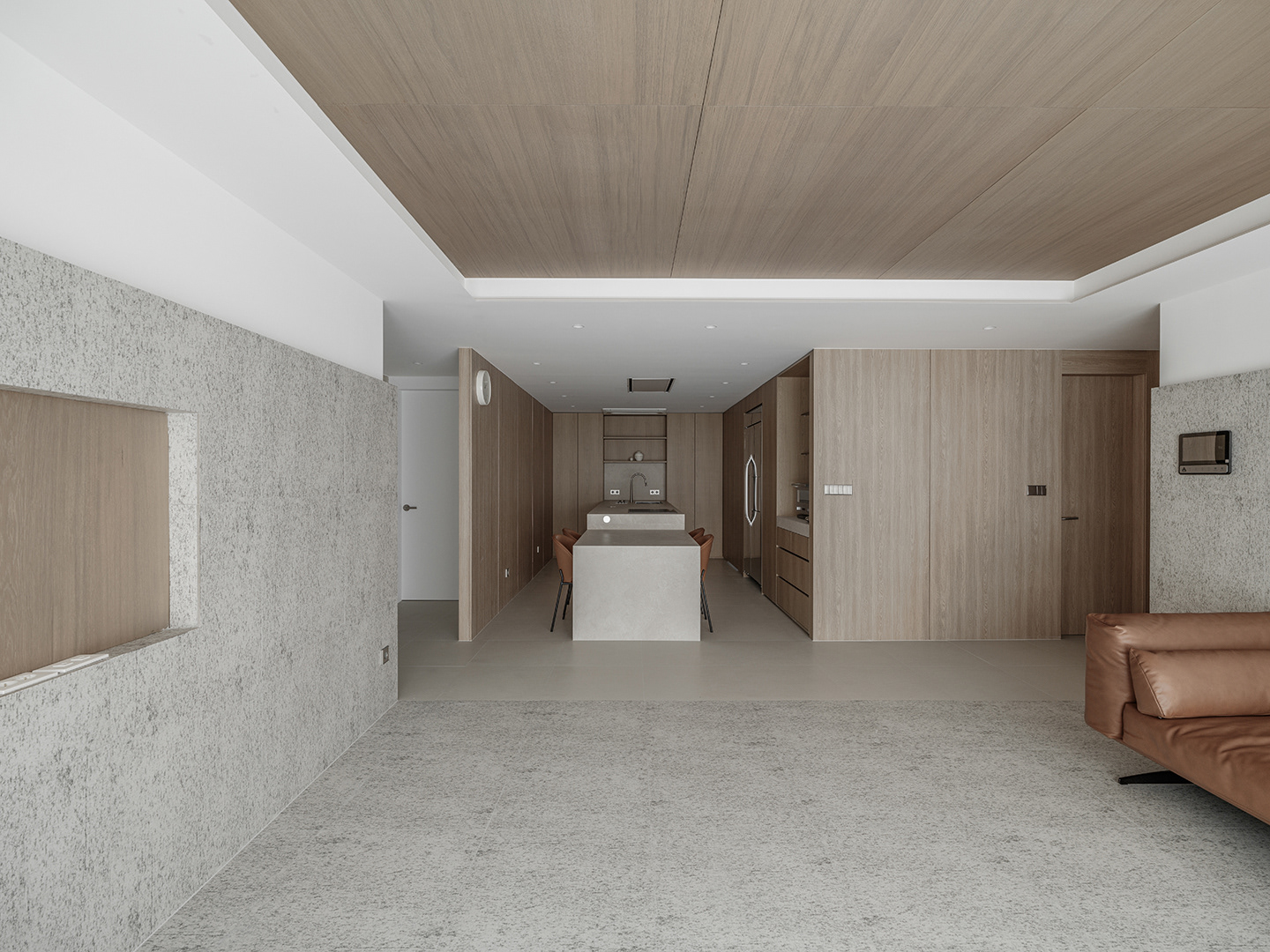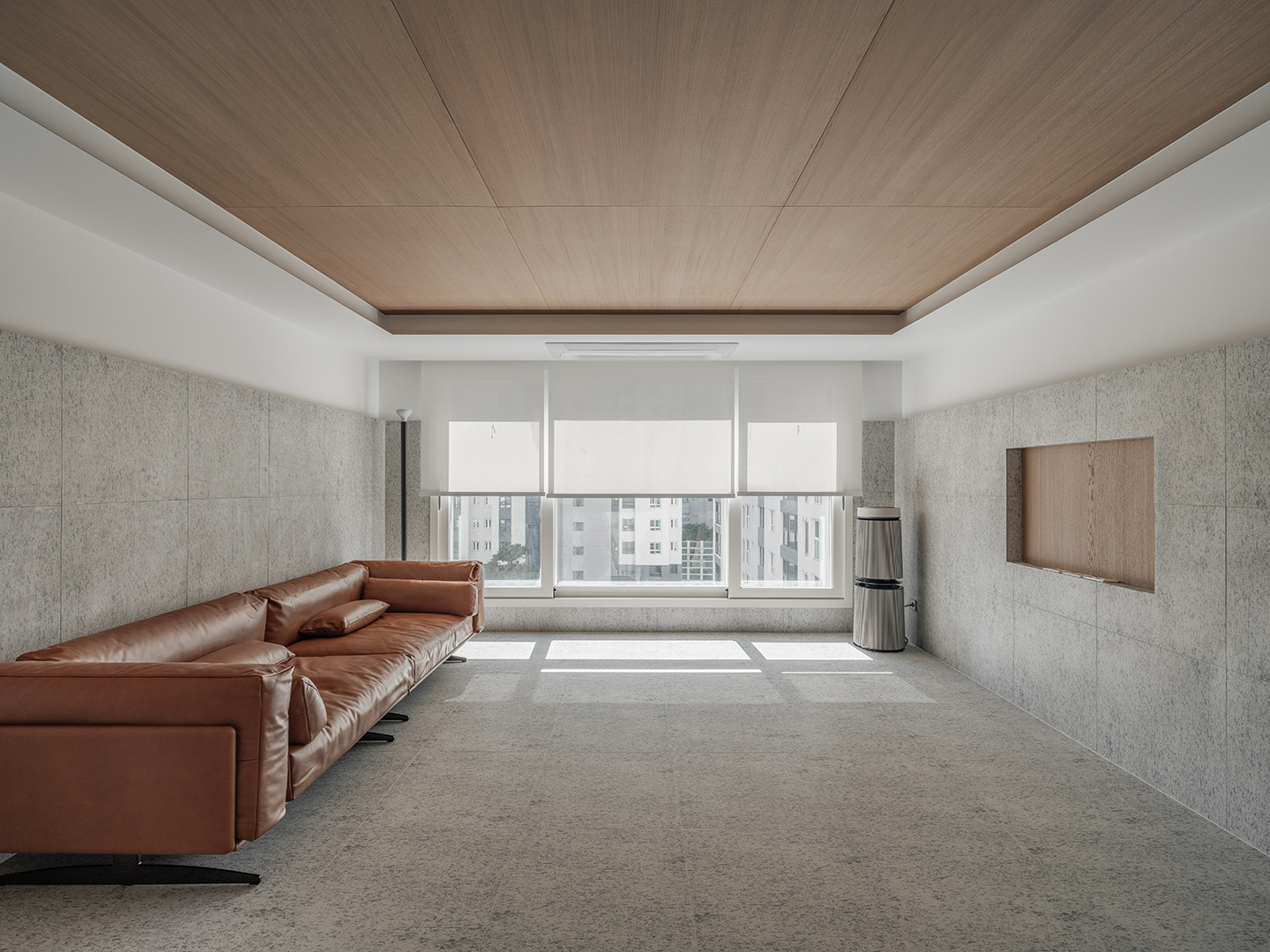 오썸디자인 스튜디오는 공간을 분할하는 레이아웃을 바탕으로, 거실·주방·복도에 서로 다른 마감재와 재질을 적용해 마치 호텔 라운지와 같은 고급스러운 흐름을 완성했습니다. 특히 거실에는 스톤 계열의 세라믹 타일로 중심을 잡고, 우물 천장 위 화이트 오크 원목을 더해 견고하면서도 따뜻한 무드를 연출했습니다.