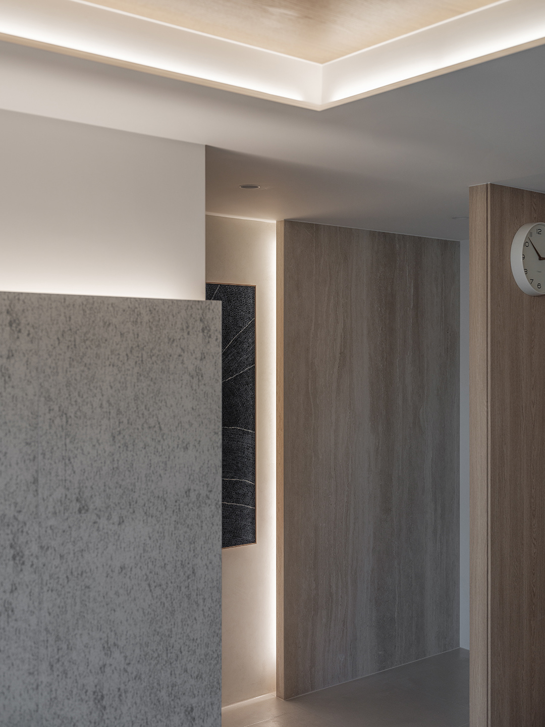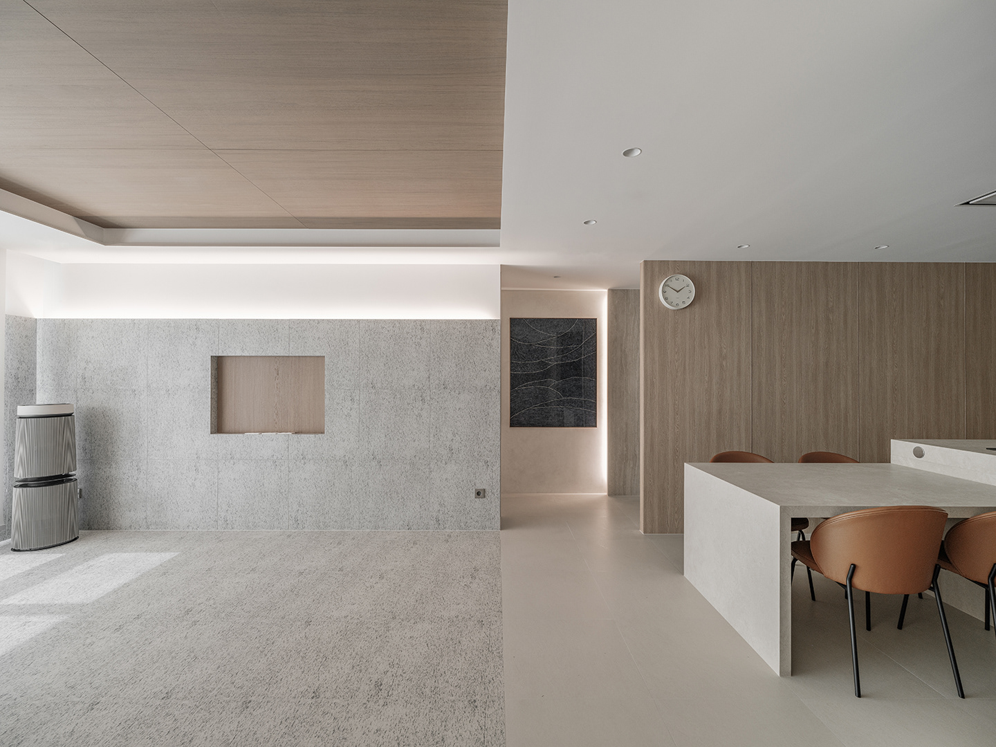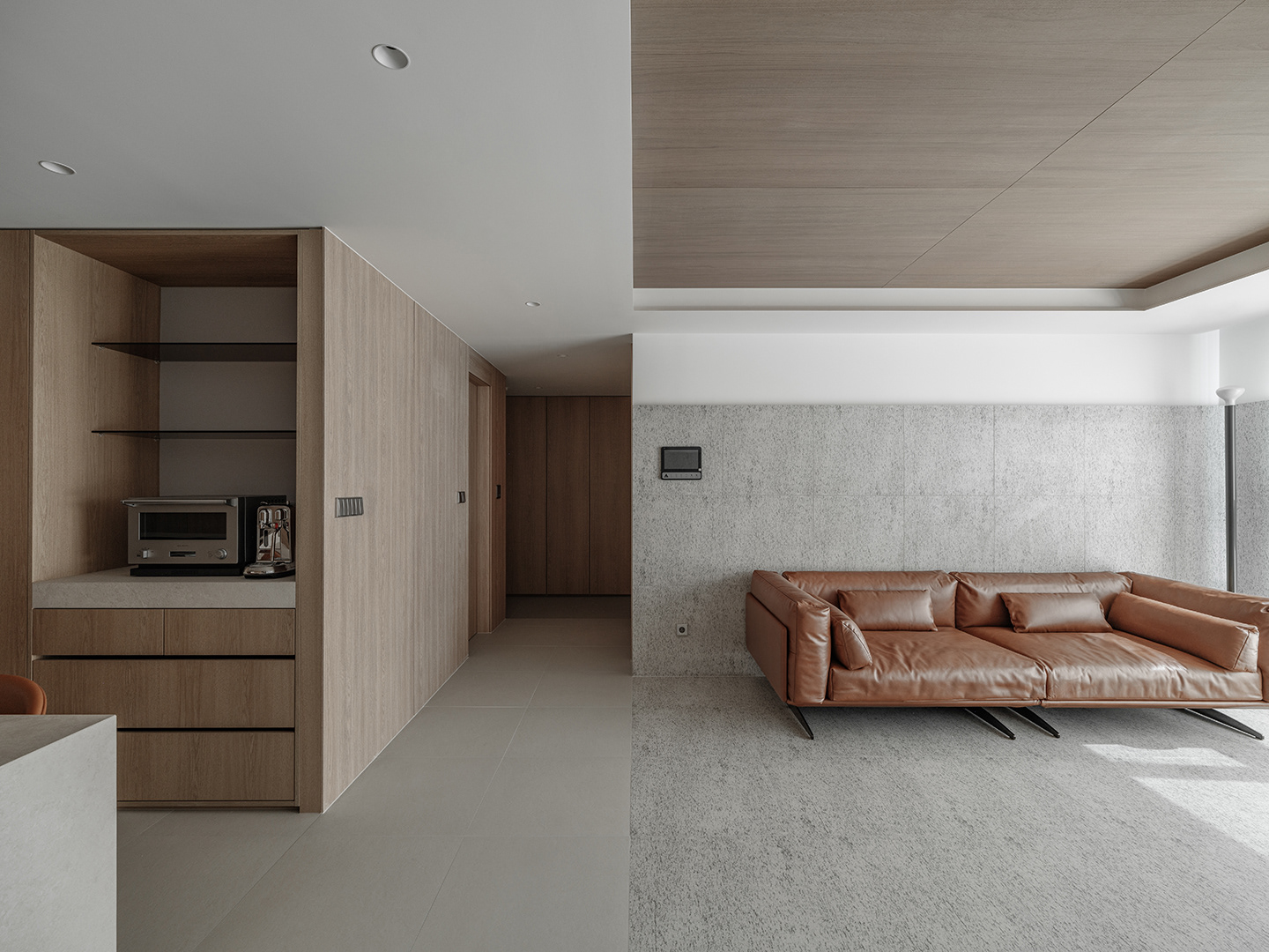 오썸디자인 스튜디오는 공간을 분할하는 레이아웃을 바탕으로, 거실·주방·복도에 서로 다른 마감재와 재질을 적용해 마치 호텔 라운지와 같은 고급스러운 흐름을 완성했습니다. 특히 거실에는 스톤 계열의 세라믹 타일로 중심을 잡고, 우물 천장 위 화이트 오크 원목을 더해 견고하면서도 따뜻한 무드를 연출했습니다.