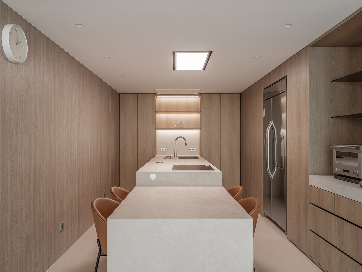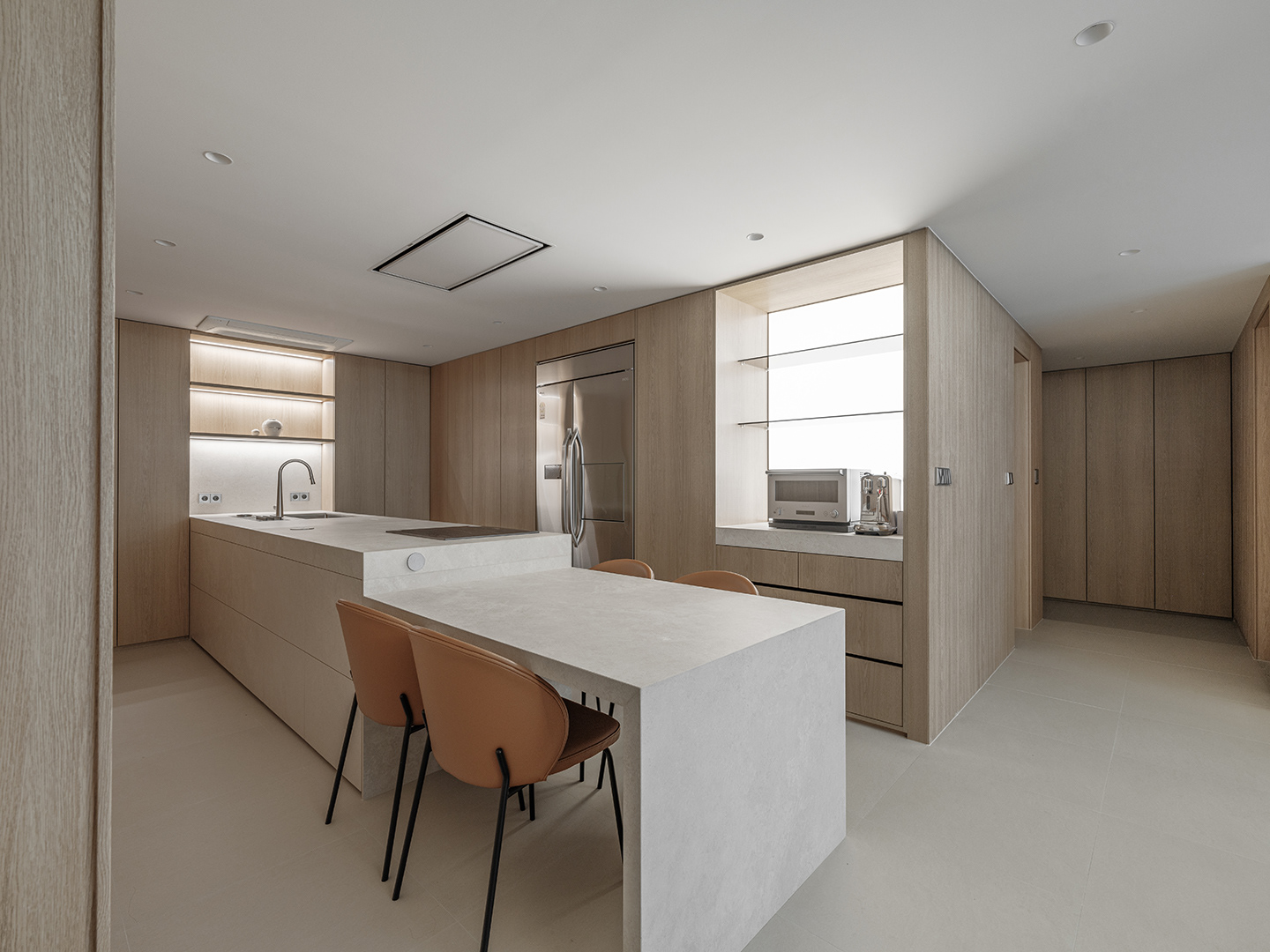 특히 아일랜드 공간은 단순한 조리대가 아닌, 거주자의 라이프스타일을 고려한 멀티 퍼포즈 공간으로 디자인되었습니다. 기존의 일자형 아일랜드는 시각적으로 단조롭고 공간을 좁아 보이게 할 수 있는 단점이 있지만, 이번 프로젝트에서는 단을 낮춘 디자인을 적용해 의자가 자연스럽게 수납될 수 있도록 설계했습니다.