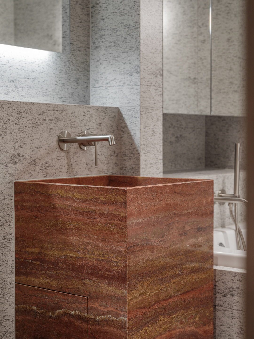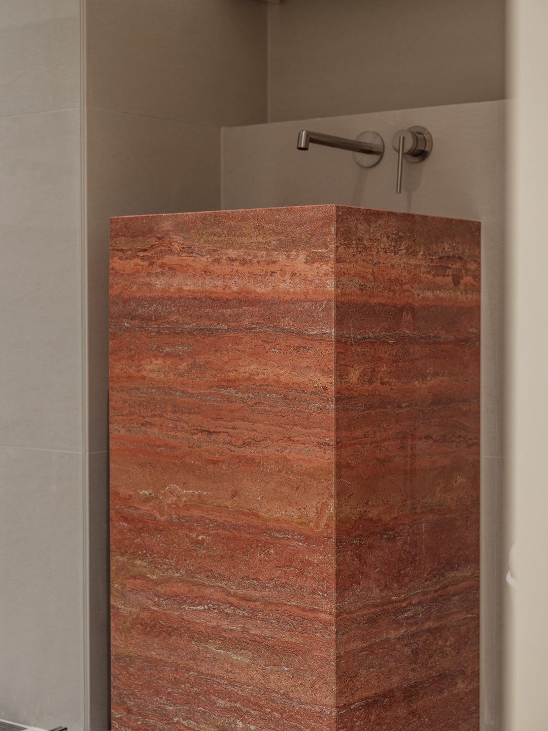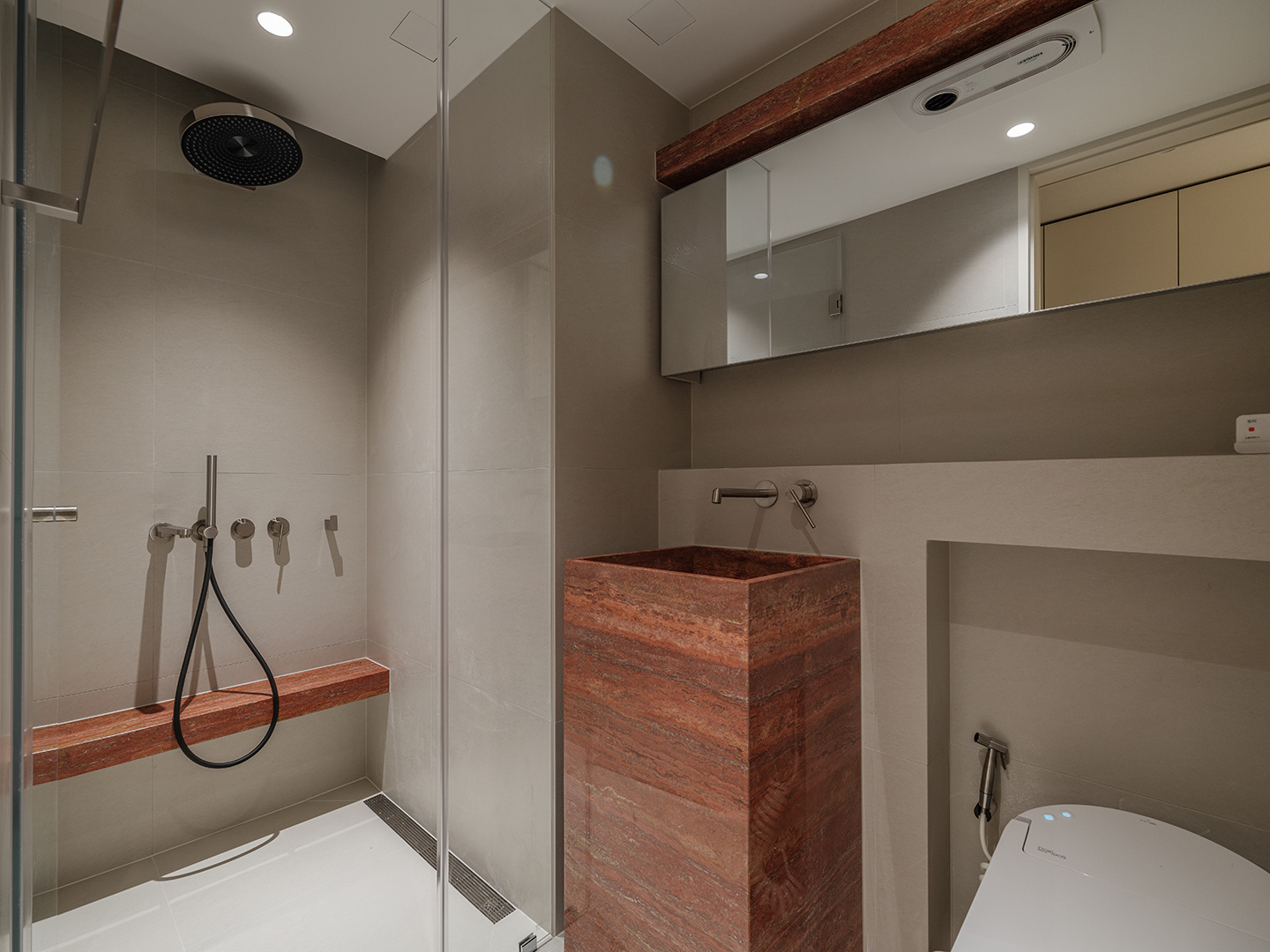 특히 세면대에 적용된 대리석 마감은 욕실의 분위기를 결정짓는 핵심 포인트로, 붉은 계열의 대리석인 '트라버틴 레드 레더'를 사용해 강렬하면서도 우아한 존재감을 더했습니다.