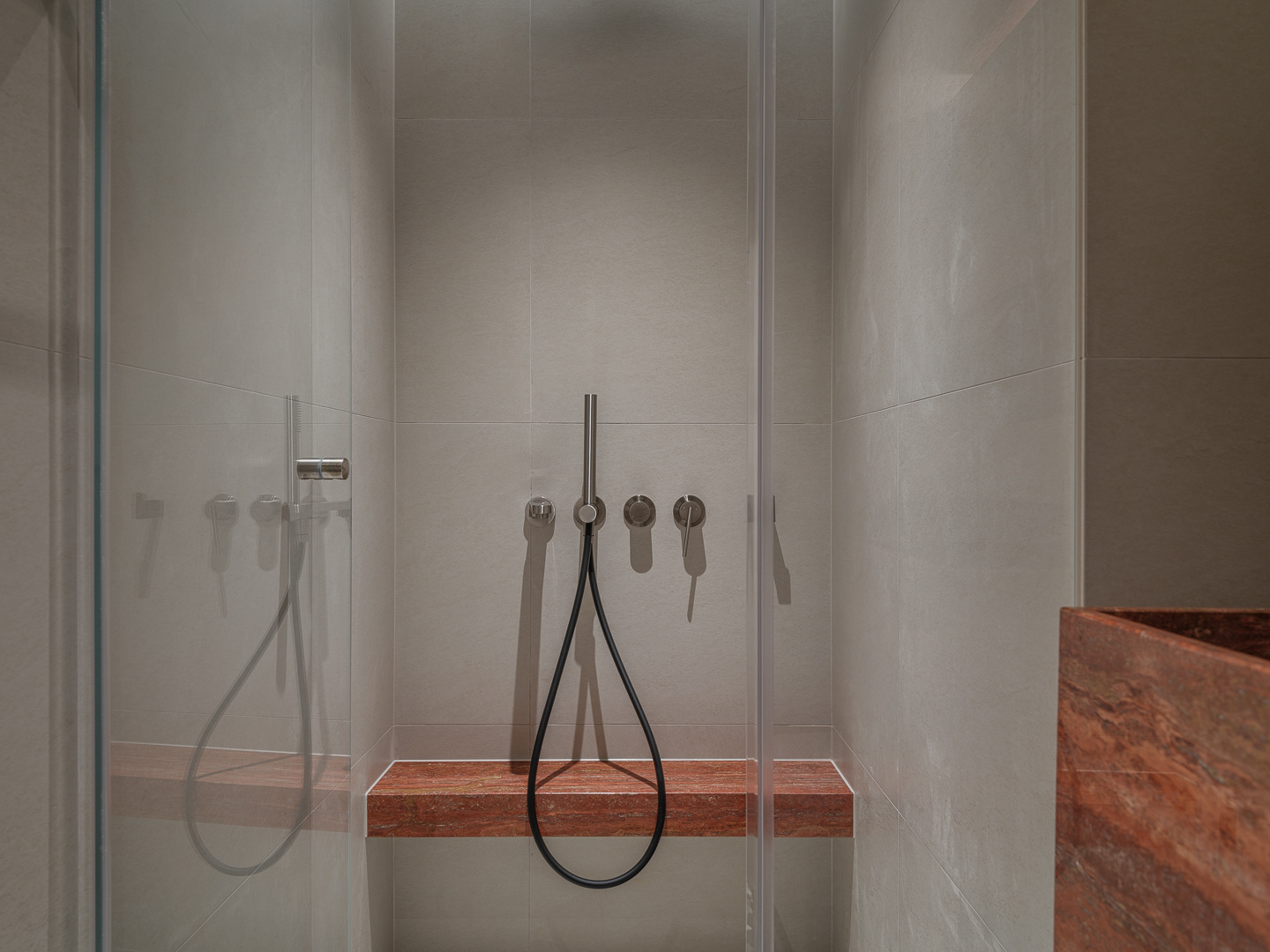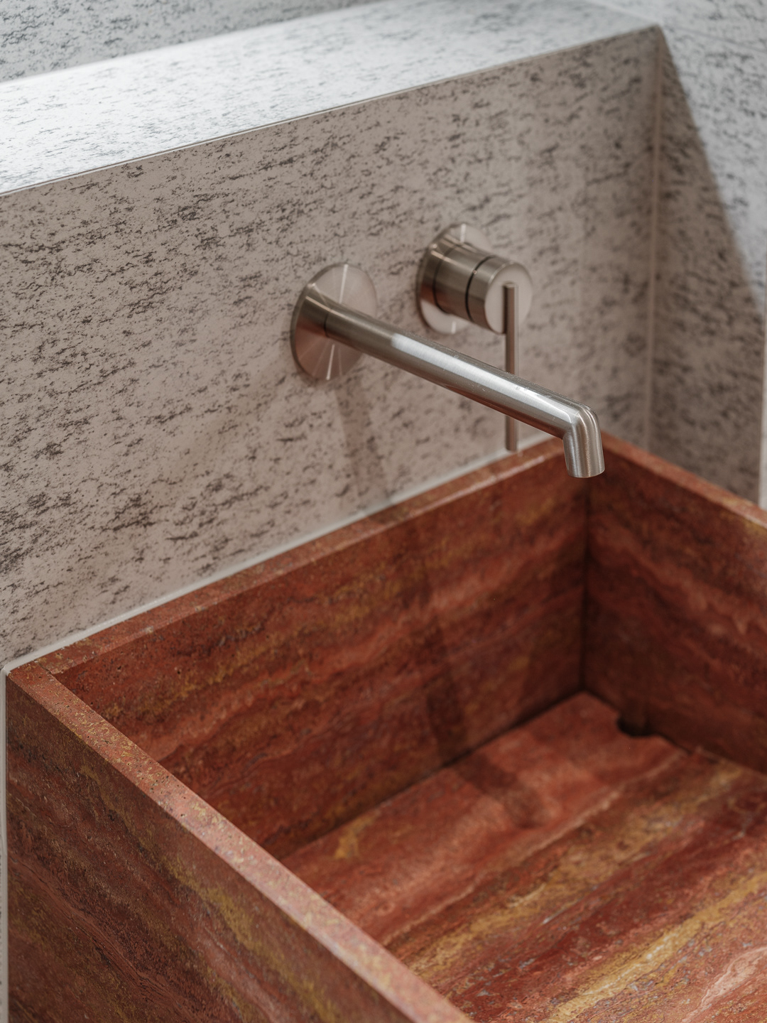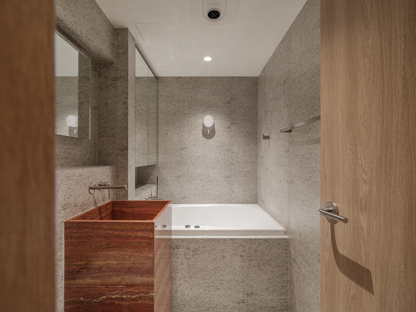 특히 세면대에 적용된 대리석 마감은 욕실의 분위기를 결정짓는 핵심 포인트로, 붉은 계열의 대리석인 '트라버틴 레드 레더'를 사용해 강렬하면서도 우아한 존재감을 더했습니다.