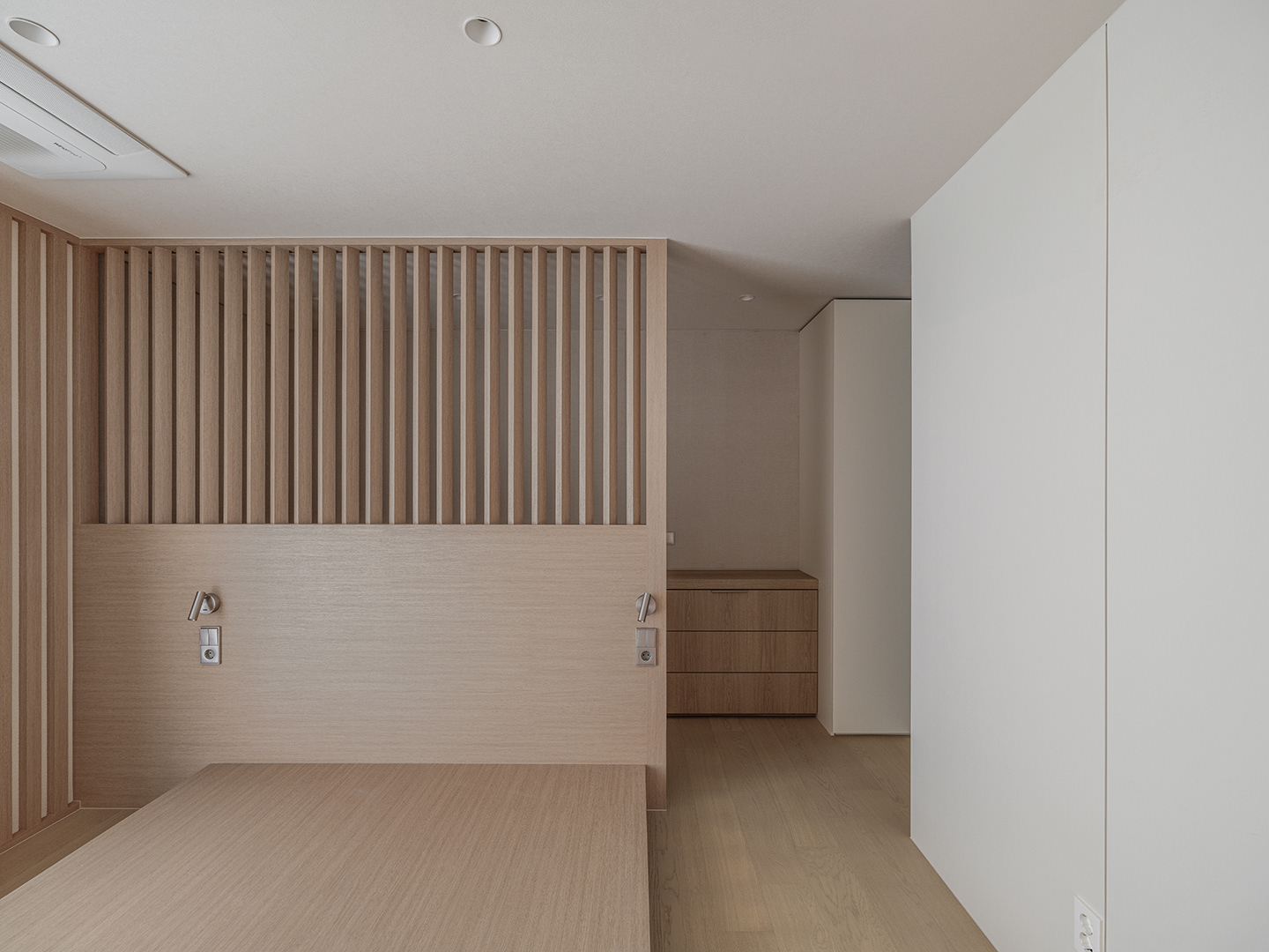 특히 간살 파티션으로 제작한 침대 헤드 디자인은 이 공간을 더욱 인상 깊게 만드는 핵심 요소로, 동양적인 이미지와 통일감을 자연스럽게 이어갑니다.